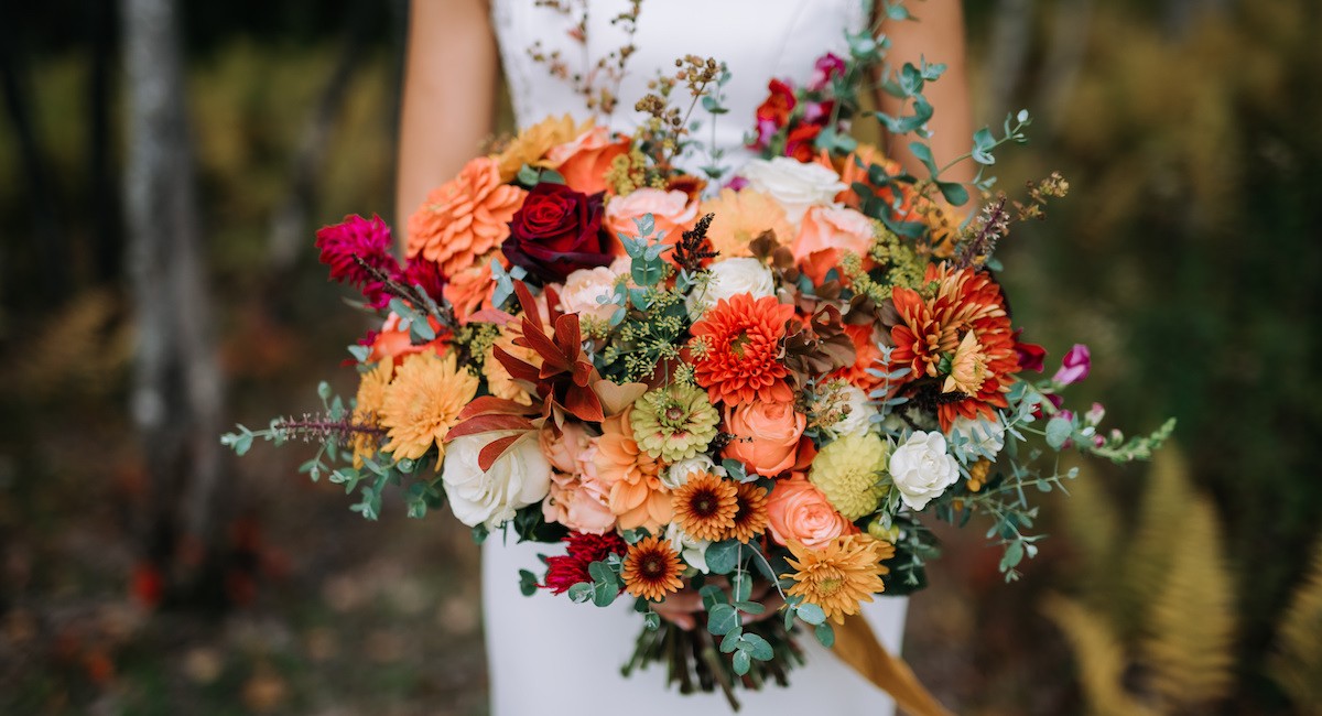A stunning mix of orange, pink, and purple blooms like roses and peonies, reminiscent of a beautiful sunset.